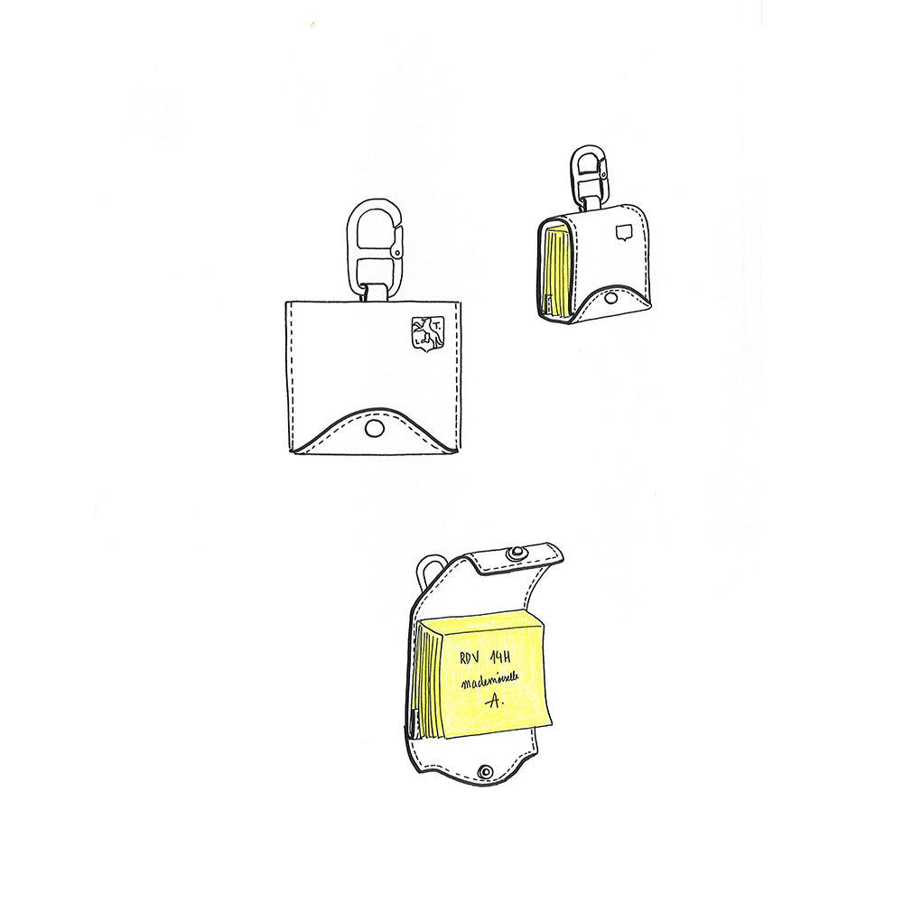Pour cette collaboration nous avons donc, en plus du sac, réalisé un porte-lunettes, car je suis toujours en train de les chercher, un porte-stylo, un porte-post-it et un petit porte-photo. Les accessoires sont évidemment amovibles et peuvent s’accrocher aux anneaux des anses bijoux aux finitions shiny nickel.