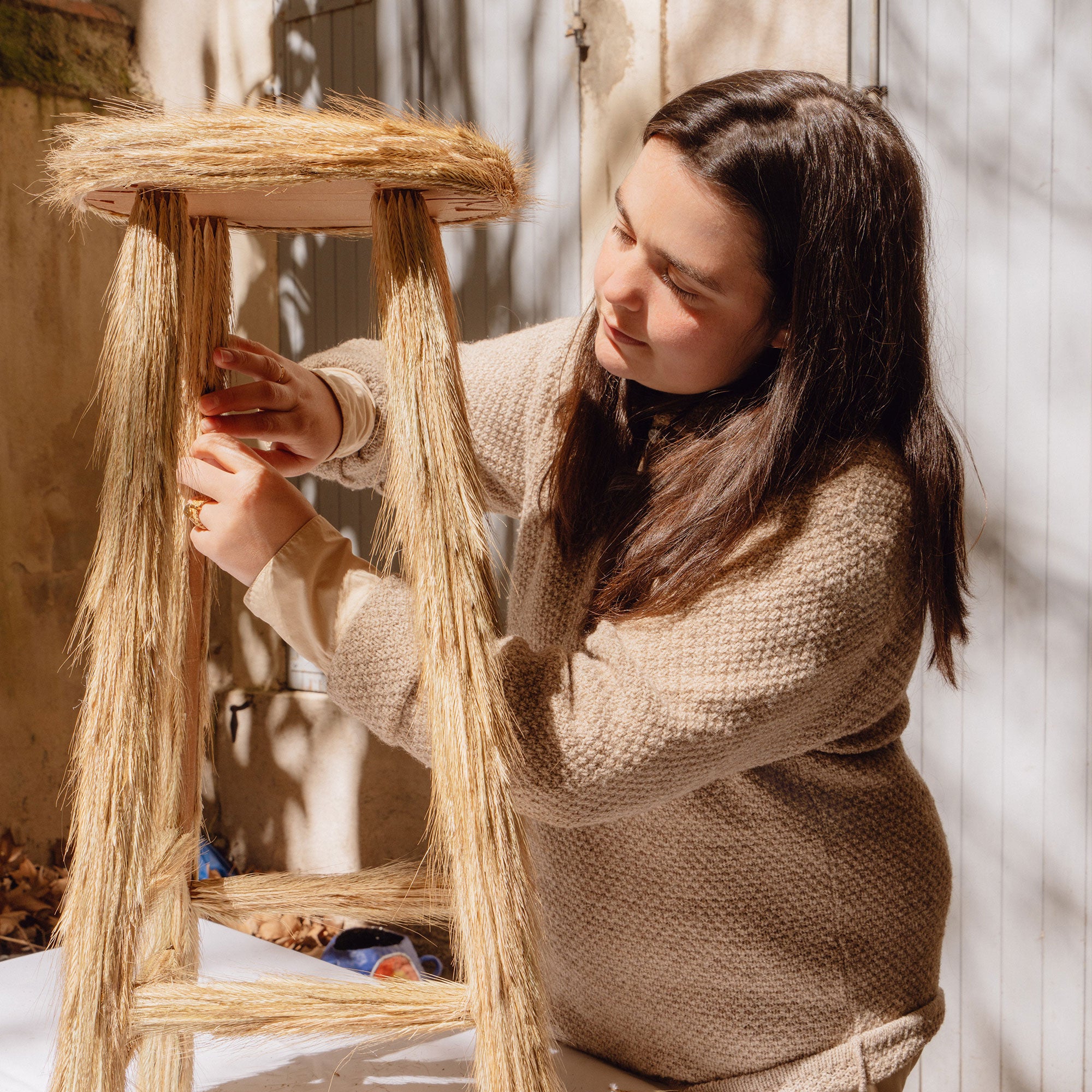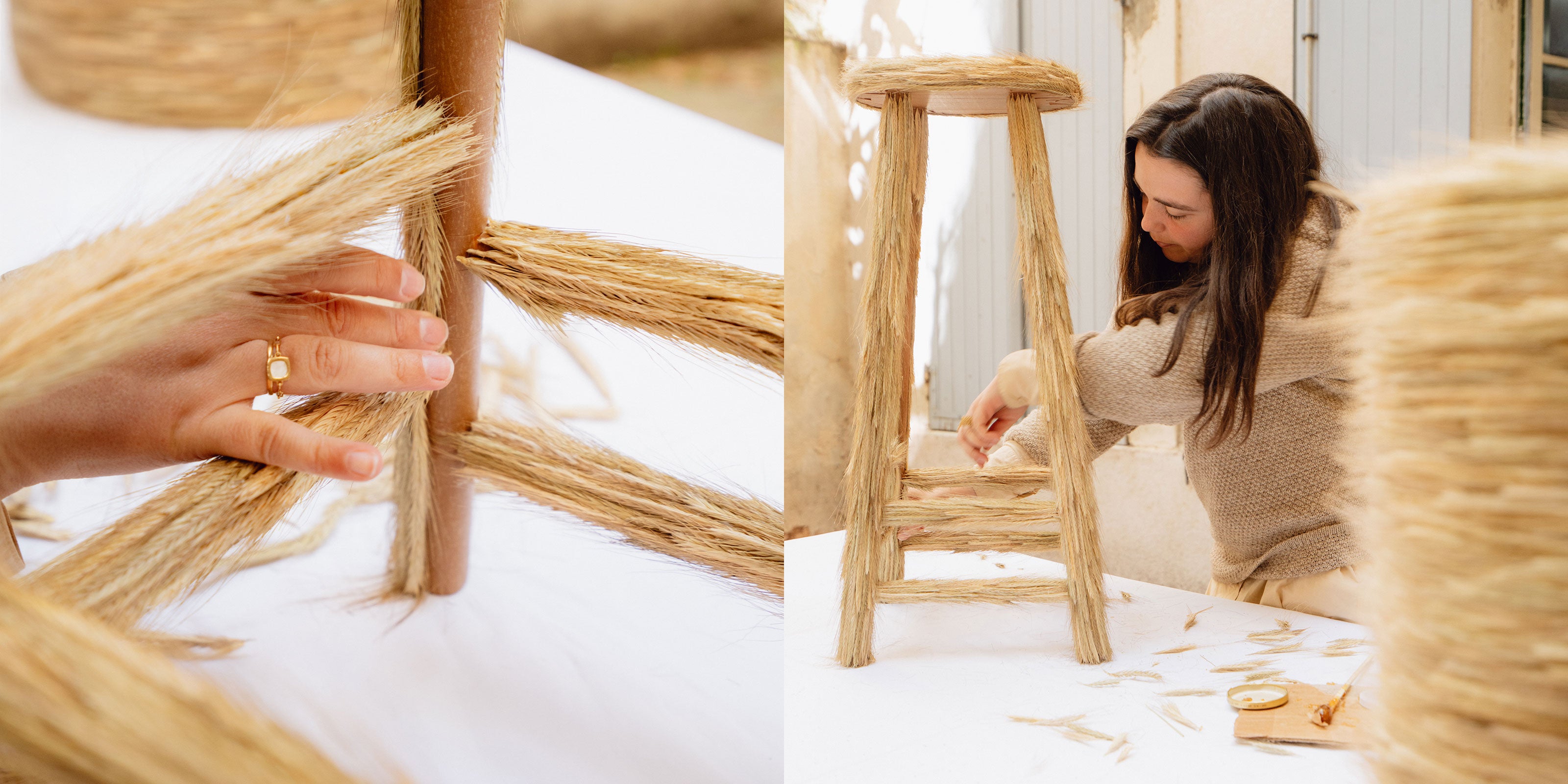 Stroh bietet unglaublich viele kreative Möglichkeiten. Man kann daraus feine Kordeln, Körbe, Kleidung, filigrane Stickereien oder Blumensträuße machen. Außerdem liebe ich Stroh, weil es ein Symbol der bäuerlichen Welt ist. Meine Großeltern waren Bauern. Ich habe viel Zeit auf ihrem Hof verbracht, und viele Erinnerungen von dort fließen heute in meine kreative Arbeit ein. Seit ein paar Jahren baue ich die Pflanze selbst an. Ich möchte sehen, wie sie wächst, sie besser verstehen und mit allen Teilen arbeiten – mit den Ähren genauso wie mit den Blättern.