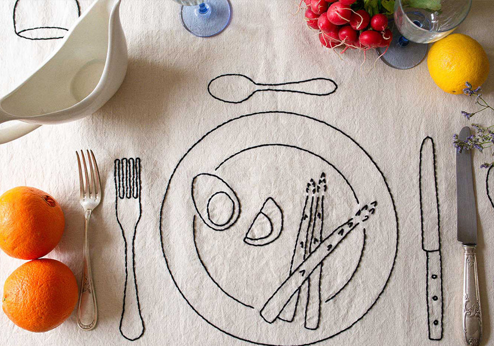 Künstlerin und Designerin, mit der wir zusammengearbeitet haben, um gestickte Tischdecken zu kreieren. Sarah ist eine dieser Personen, die man immer gerne im Schatten einer Terrasse in Marseille – oder direkt in ihrem Atelier – trifft, um über unsere gemeinsame Leidenschaft für schöne Dinge zu sprechen.