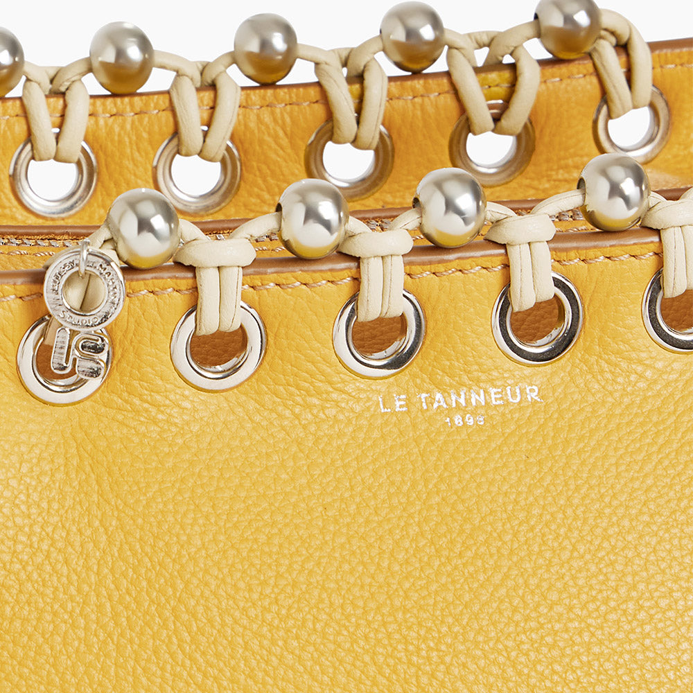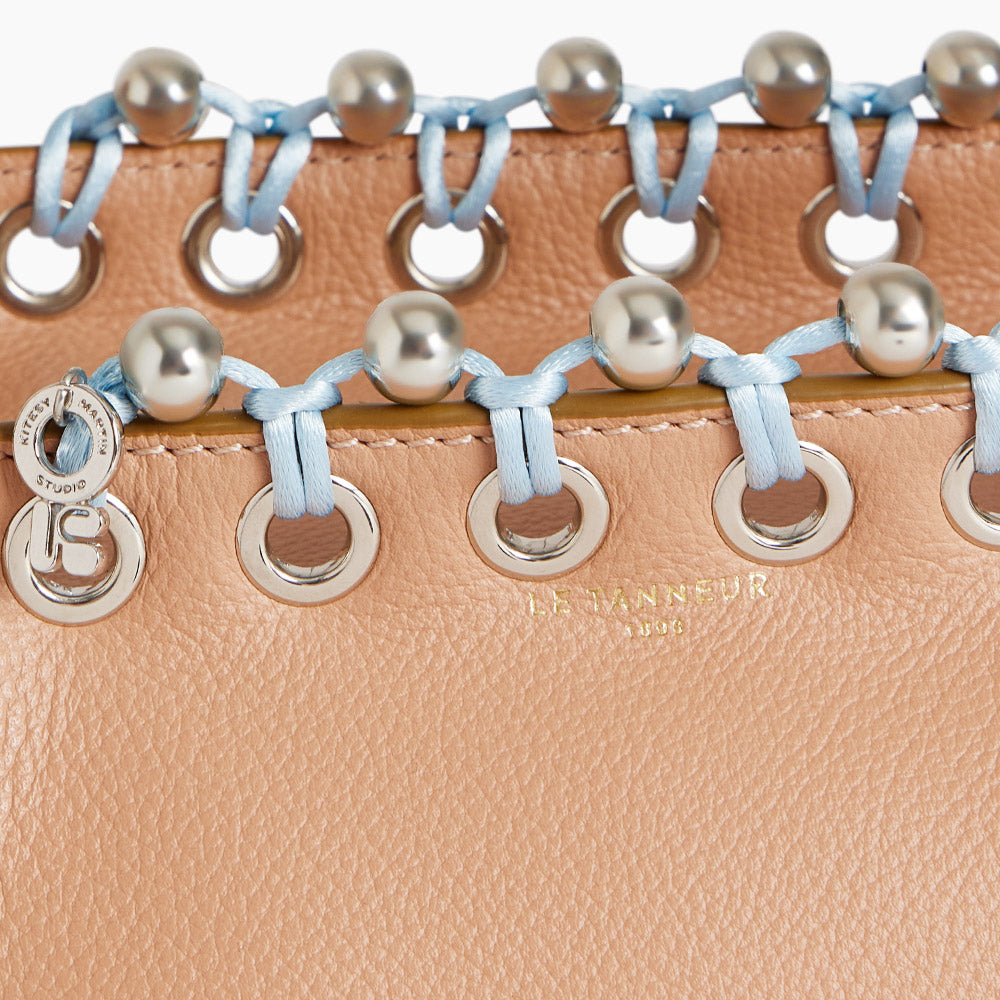 Ich bin über das Textildesign zum Schmuck gekommen. Ich gestalte Schmuck also auf eine andere Weise als ein Goldschmied oder spezialisierter Designer. Mit Le Tanneur entstand die Idee, ausgehend von der Tasche Louise Schmuck-Details für Taschen zu entwerfen. Wir haben in unser Flechtwerk Metallperlen integriert und Ösen gesetzt – für einen raffinierten „Schmuck-Effekt“.