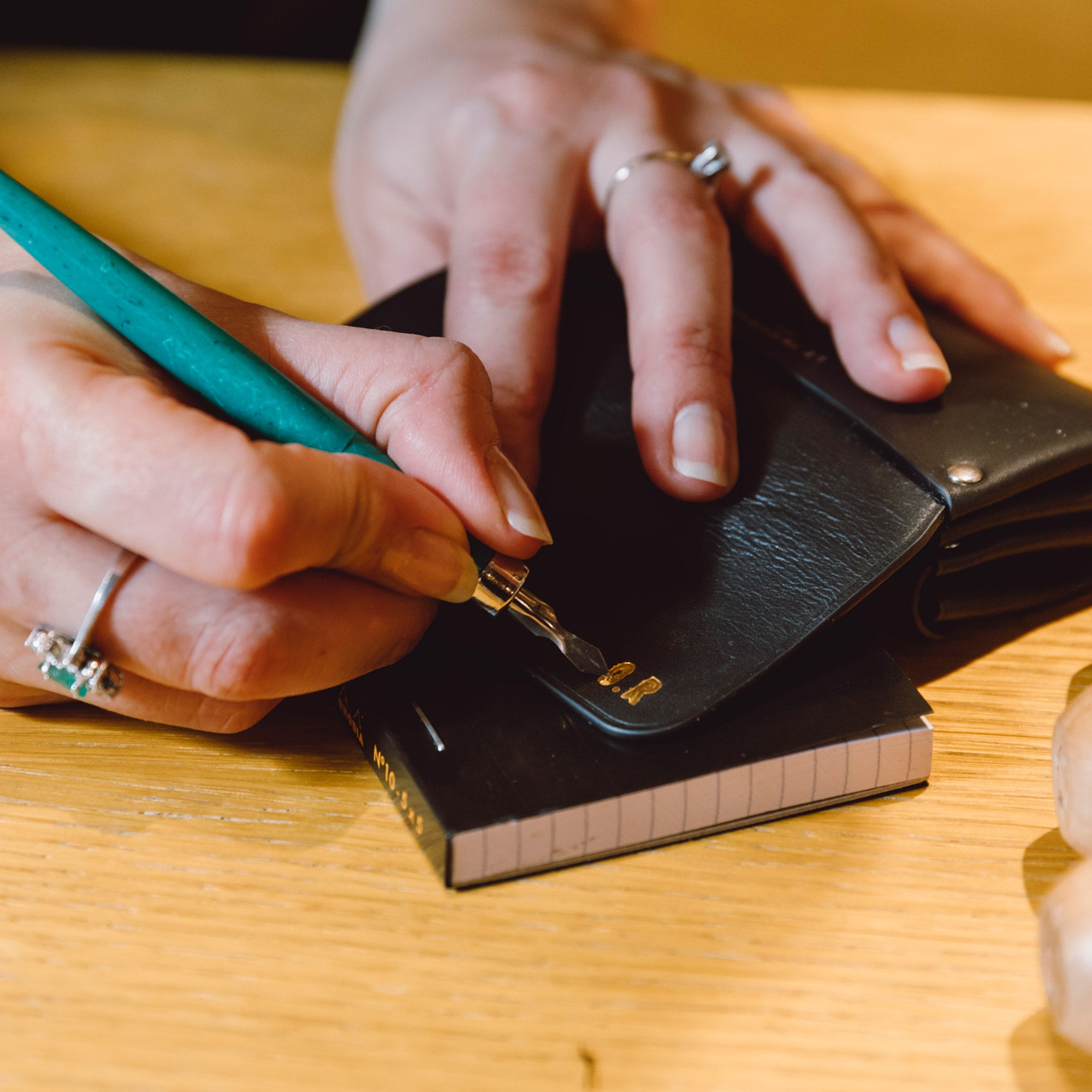 Nichts macht ein Geschenk einzigartiger als die Personalisierung. Stellen Sie sich ein personalisiertes Lederstück vor, das mit Ihren Initialen, einem Namen oder einer liebevollen Botschaft verziert ist, zart graviert durch eine exklusive handwerkliche Technik. Diese maßgeschneiderte Herangehensweise bieten wir Ihnen dank unserer Zusammenarbeit mit einer talentierten Vergolderkünstlerin an, deren Können es ermöglicht, Ihre Lederkreationen mit einem Goldblatt-Finish zu veredeln.