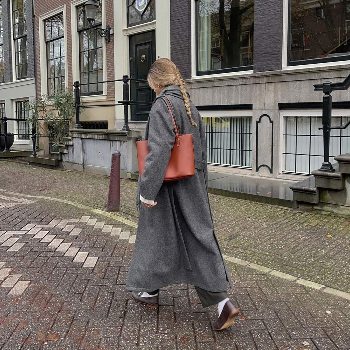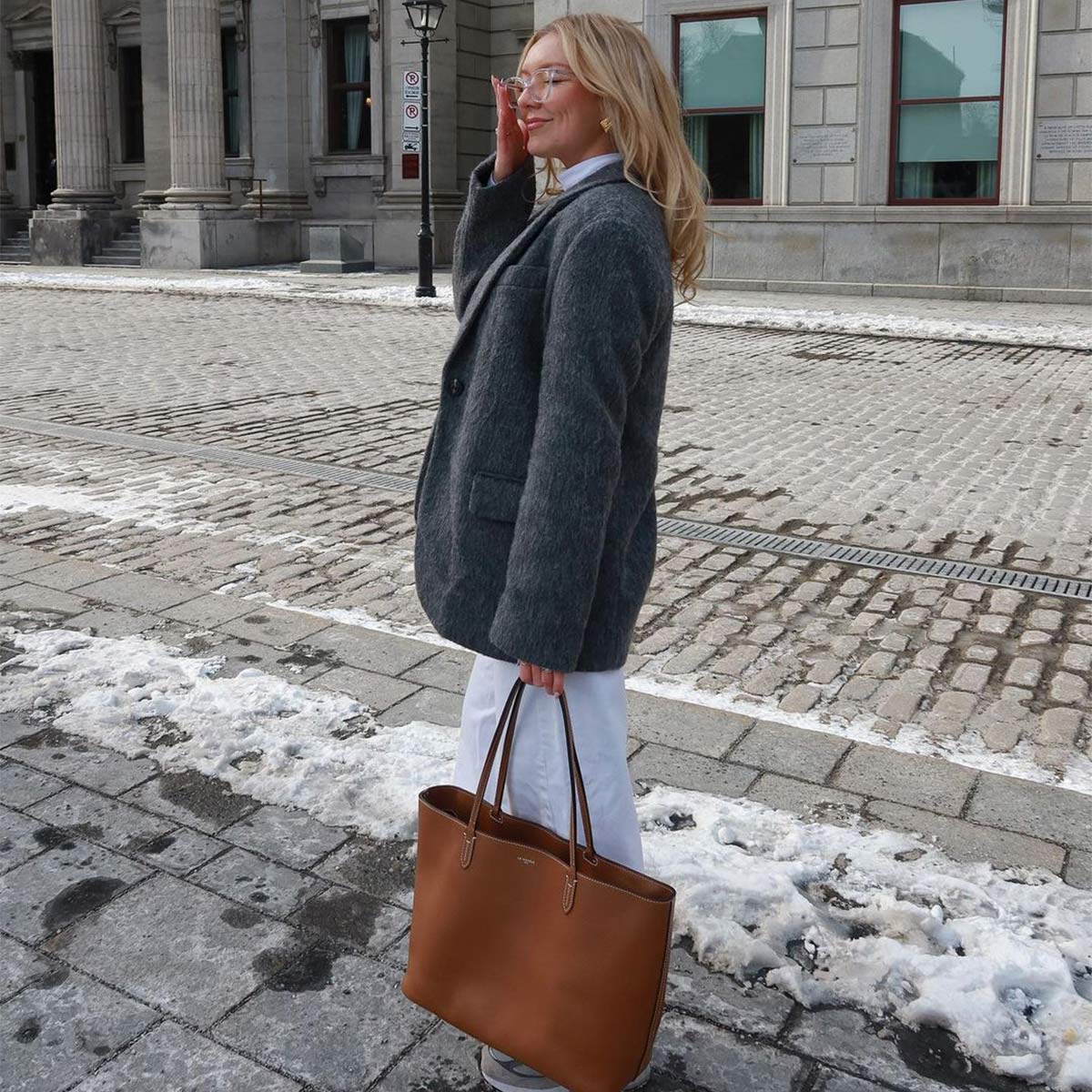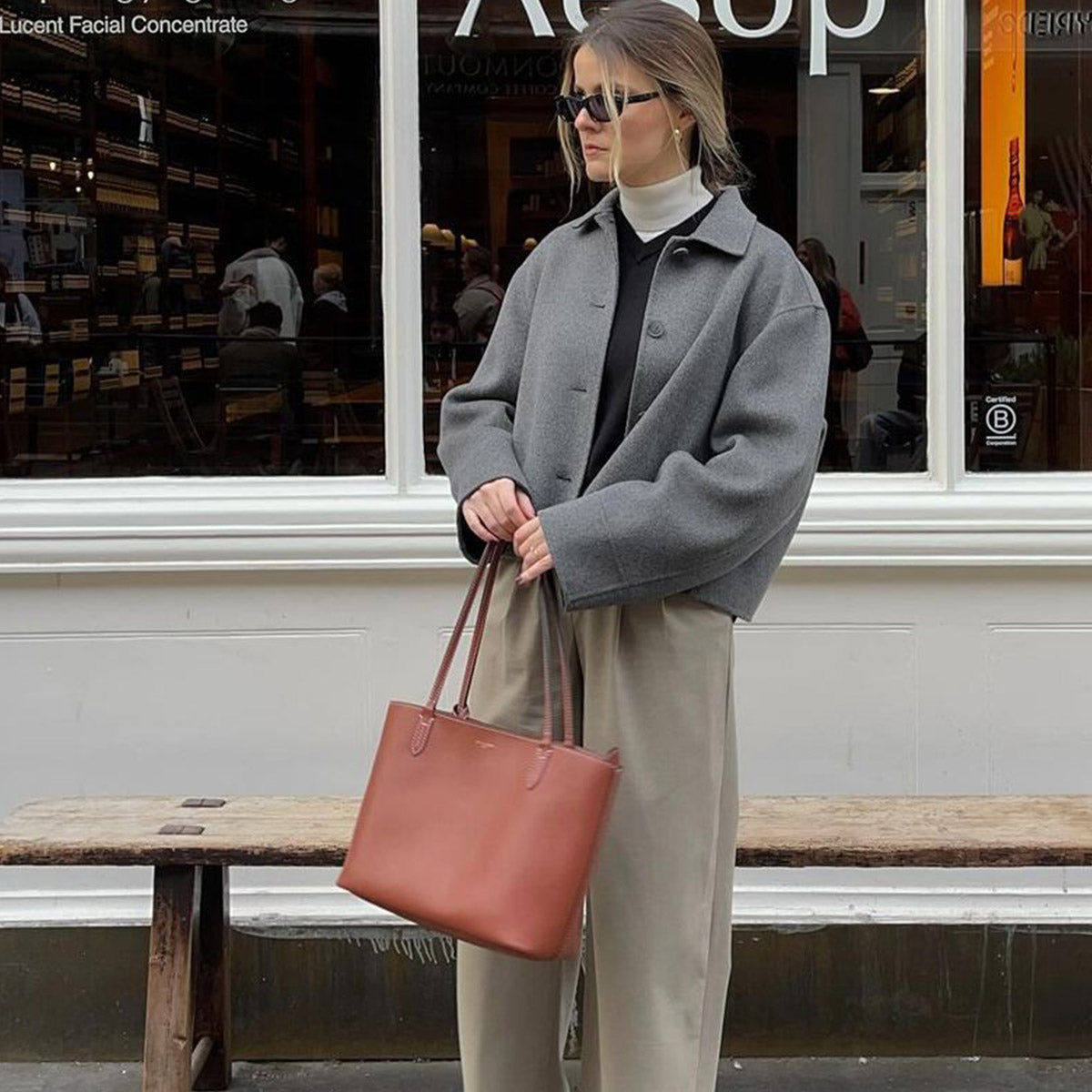 Große Tragetasche aus doppelseitig genarbtem Leder mit kontrastierender Innenseite. Reißverschluss und herausnehmbare Clutch. Wird über der Schulter getragen. Kann einen 16" Laptop aufnehmen.